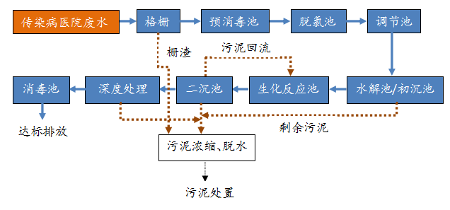 醫院廢水指醫院門診、病房、手術室、各類檢驗室、病理解剖室、放射室、洗衣房、太平間等處排出的診療、生活及糞便污水。當辦公、食堂、宿舍等排水與上述污水混合排出時亦視為醫院污水。醫院廢水處理工藝流程如下所示: