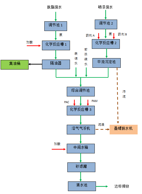 噴涂工藝在金屬表面處理中運(yùn)用極其廣泛,在生產(chǎn)過程中基本上都有噴涂廢水產(chǎn)生,噴涂廢水中呈酸性且含有多種金屬離子和非金屬離子,其中有些為一類毒物,必須經(jīng)處理后達(dá)標(biāo)后排放。噴涂廢水污染物種類較多,水質(zhì)、水量波動(dòng)較大,工程、工藝設(shè)計(jì)時(shí)需對(duì)源頭水進(jìn)行分流,并對(duì)高濃度廢液進(jìn)行分質(zhì)預(yù)處理,以提高后續(xù)處理工藝的穩(wěn)定性,進(jìn)而確保噴涂廢水處理穩(wěn)定達(dá)標(biāo)排放。